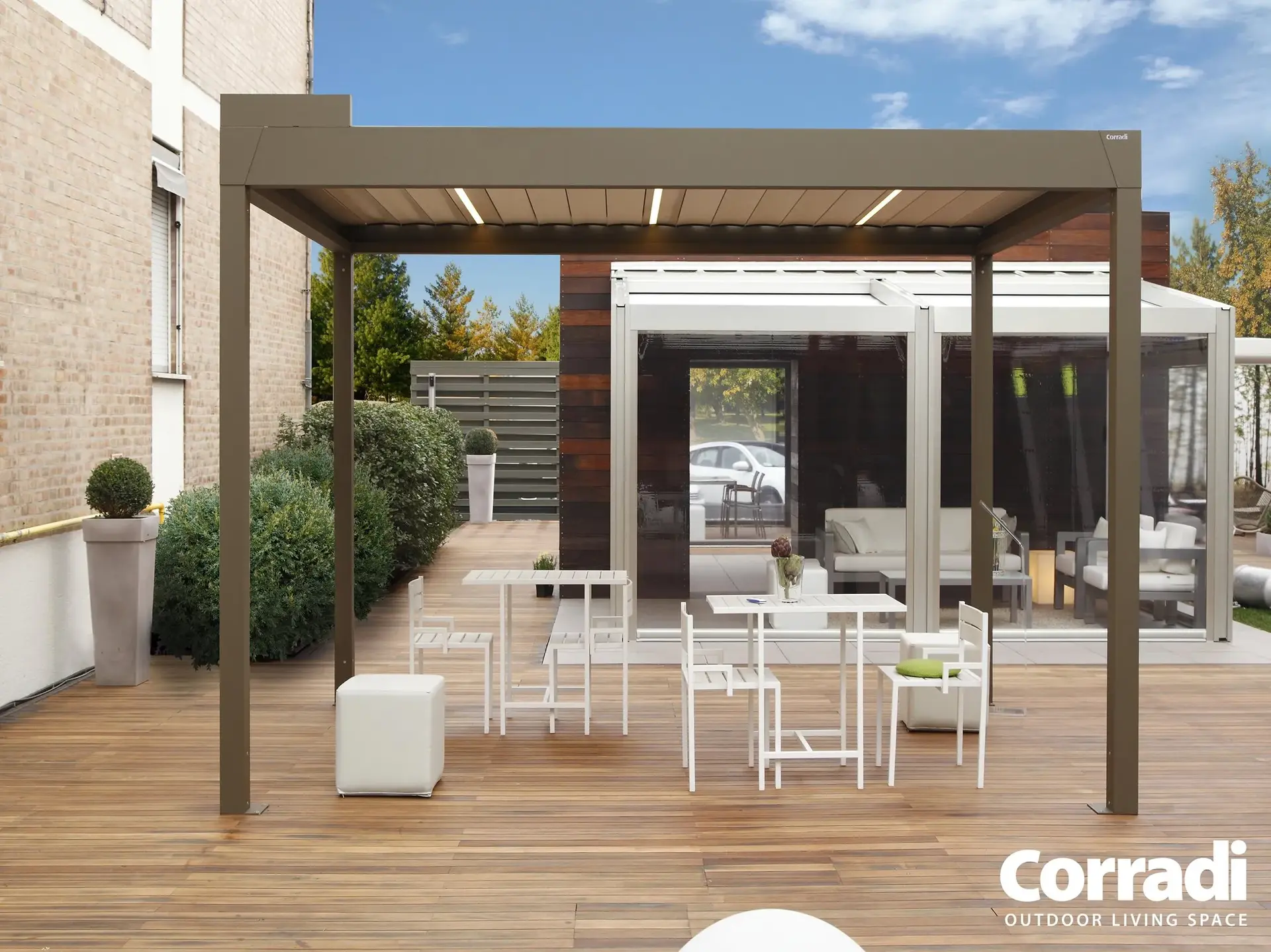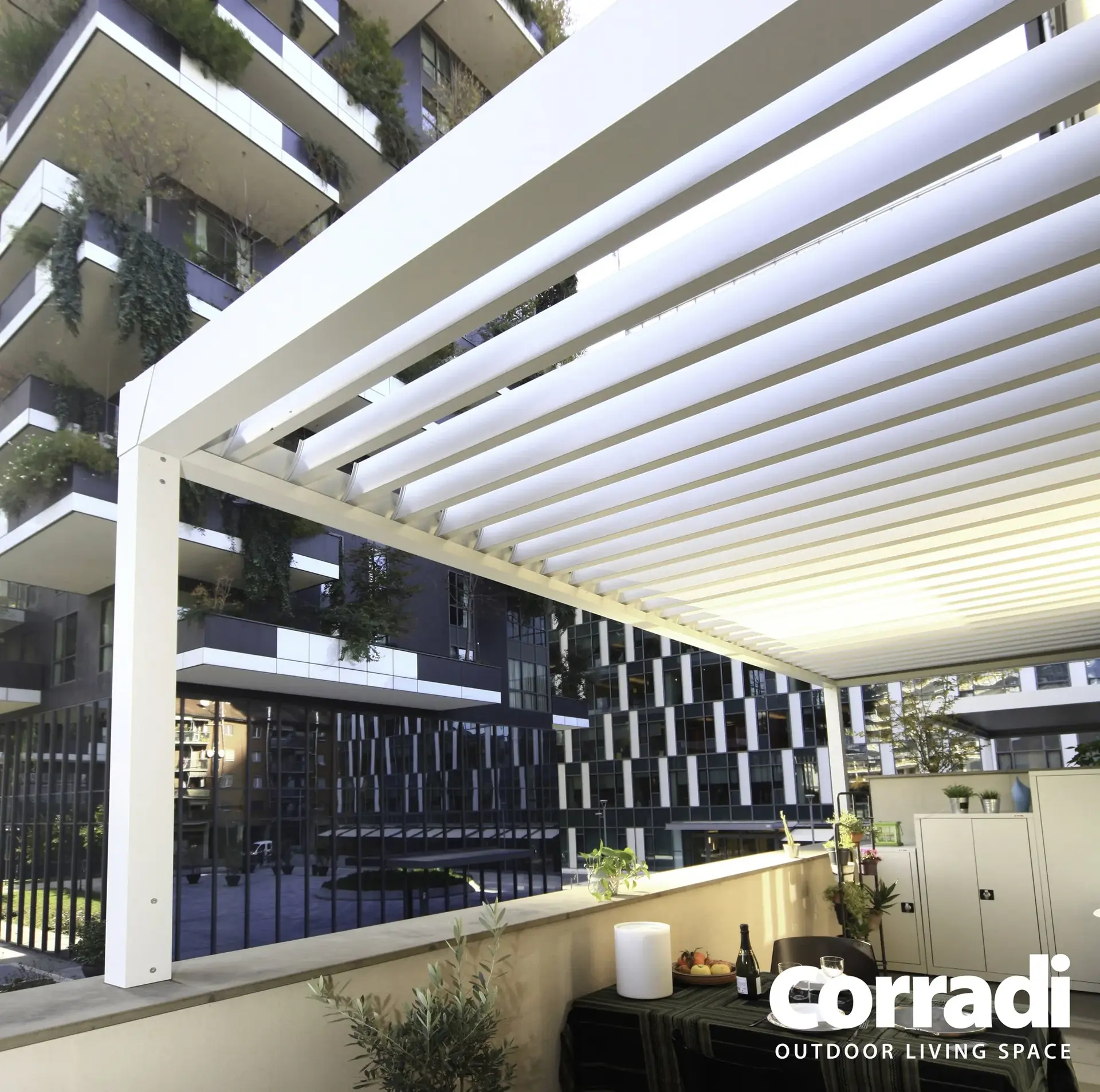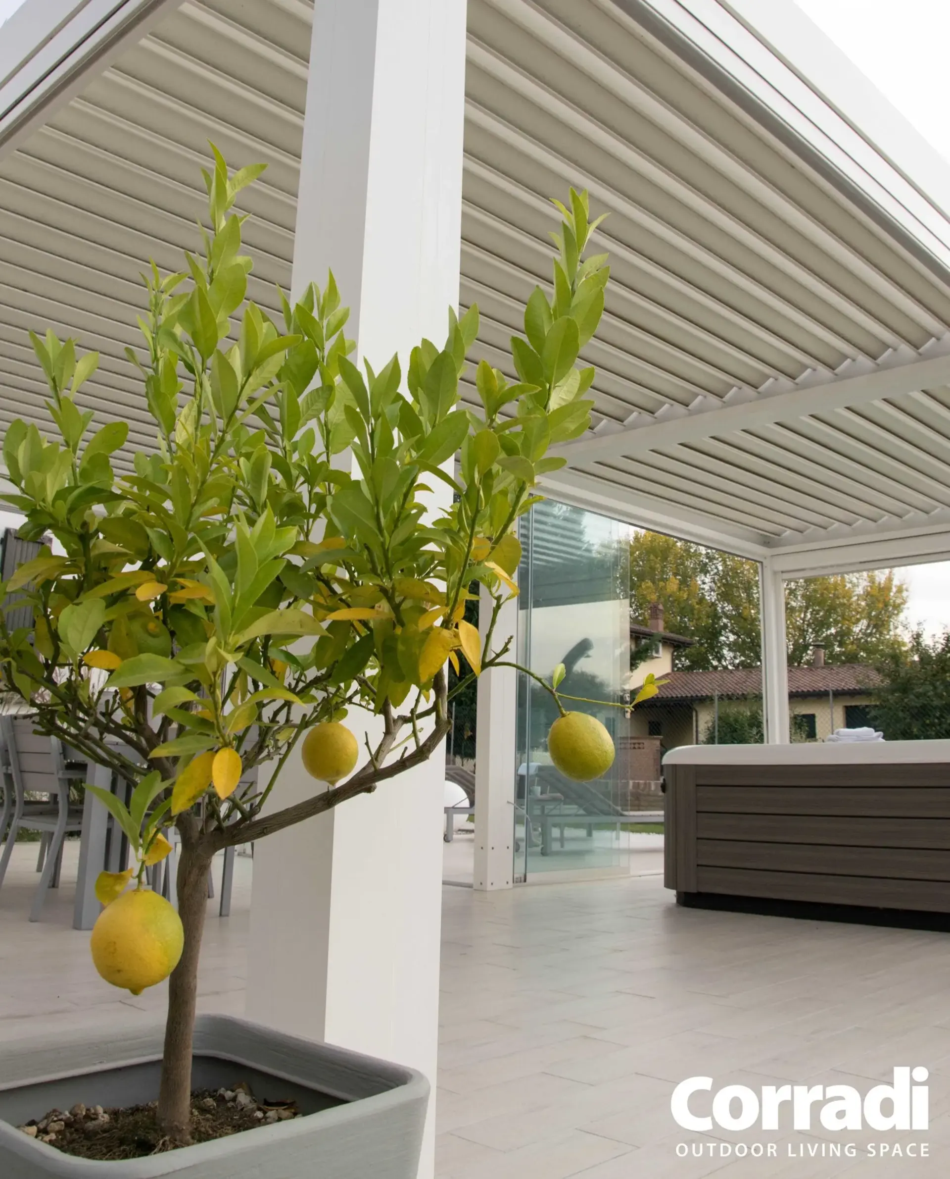 Le na ta način lahko zunanji prostor postane prava izraznost vsake ustvarjalne ideje, prilagodljiv v pohištvu, uporabi in celo v barvah. Tako kot druge bioklimatske pergole Corradi, je tudi Alba na voljo v različnih odtenkih – od najbolj klasičnih do najbolj ekstravagantnih. Z unikatnim, po meri prilagojenim slogom Alba vedno postane osrednja točka okolja, tudi v izvirni dvobarvni različici.